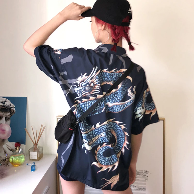 New Cheerart Harajuku Blouse Women Dragon Print Short Sleeve Shirt Summer Tops And Blouses Femme Street