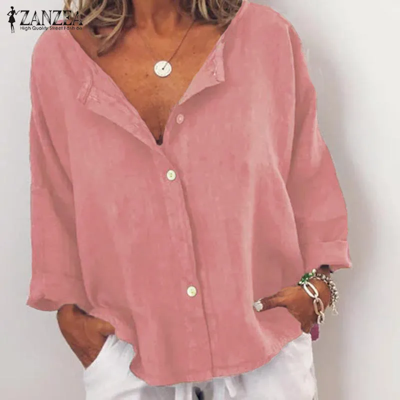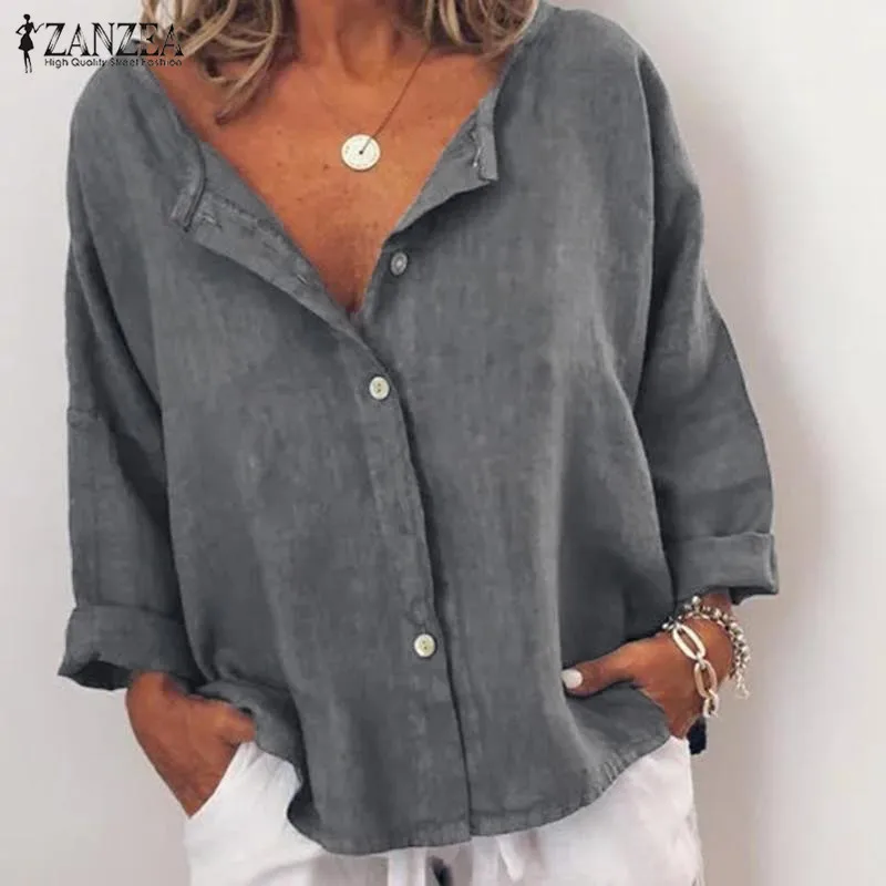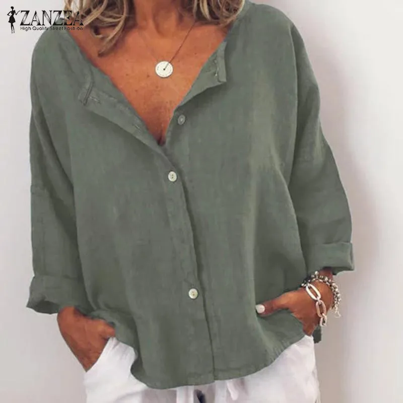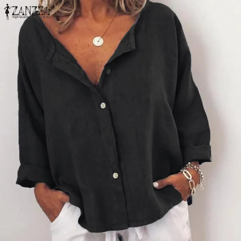 Best Fashion Women Long Sleeve Buttons Blouse ZANZEA Autumn V Neck Cotton Linen Shirt Casual Female Soli