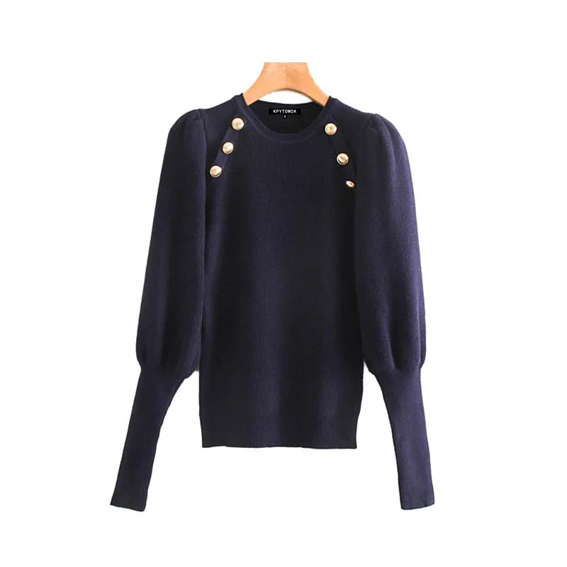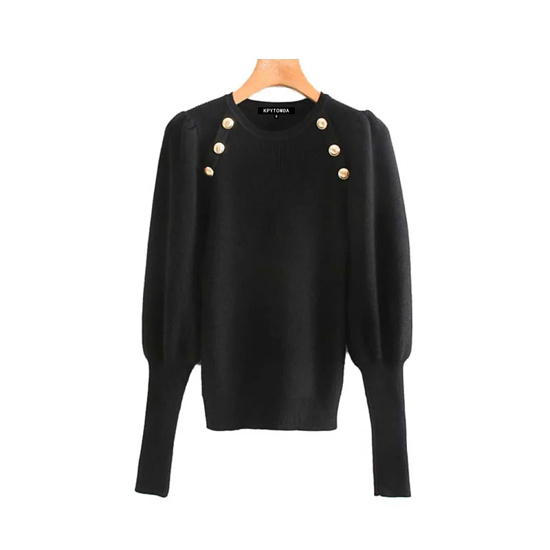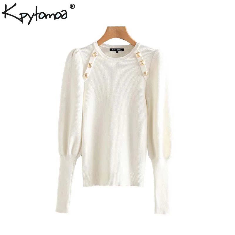 Best Vintage Elegant Faux Pearl Buttons Knitted Sweaters Women 2019 Fashion Lantern Sleeve Stretchy Offi
