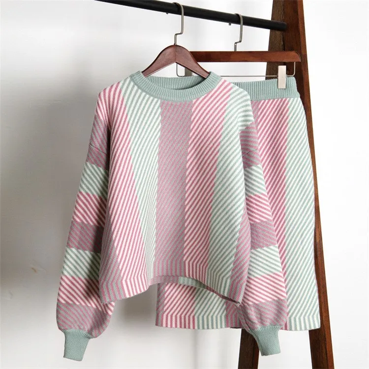 Best Fashion Women Skirt Sets Autumn Lantern Sleeve Colorful Striped Sweater Skirt Suits Female Knitted