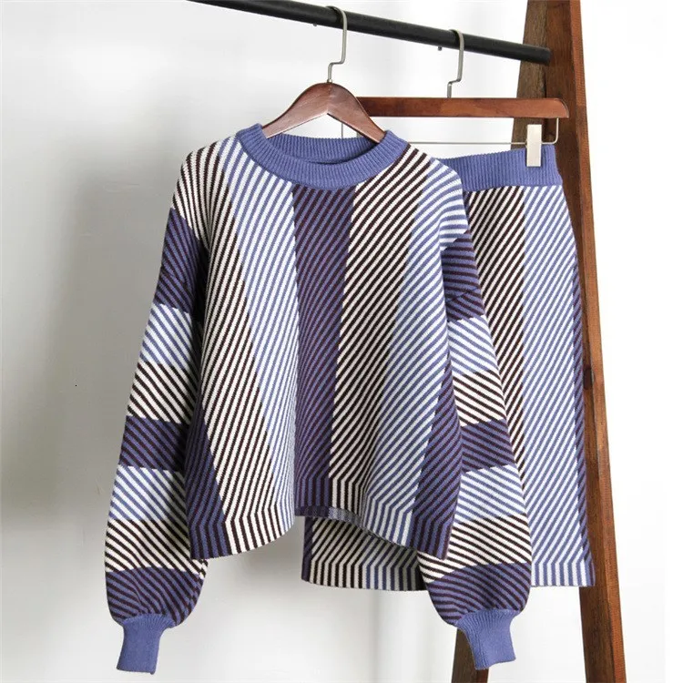Buy Fashion Women Skirt Sets Autumn Lantern Sleeve Colorful Striped Sweater Skirt Suits Female Knitted