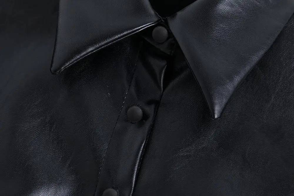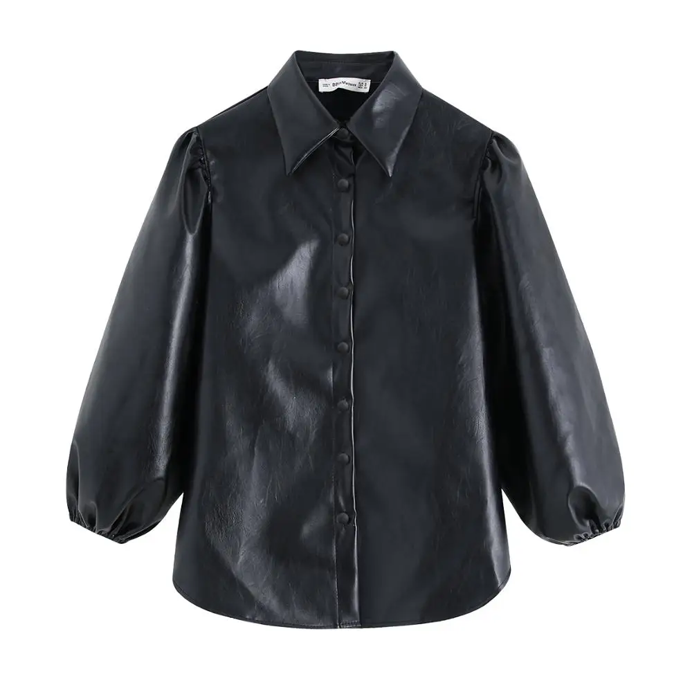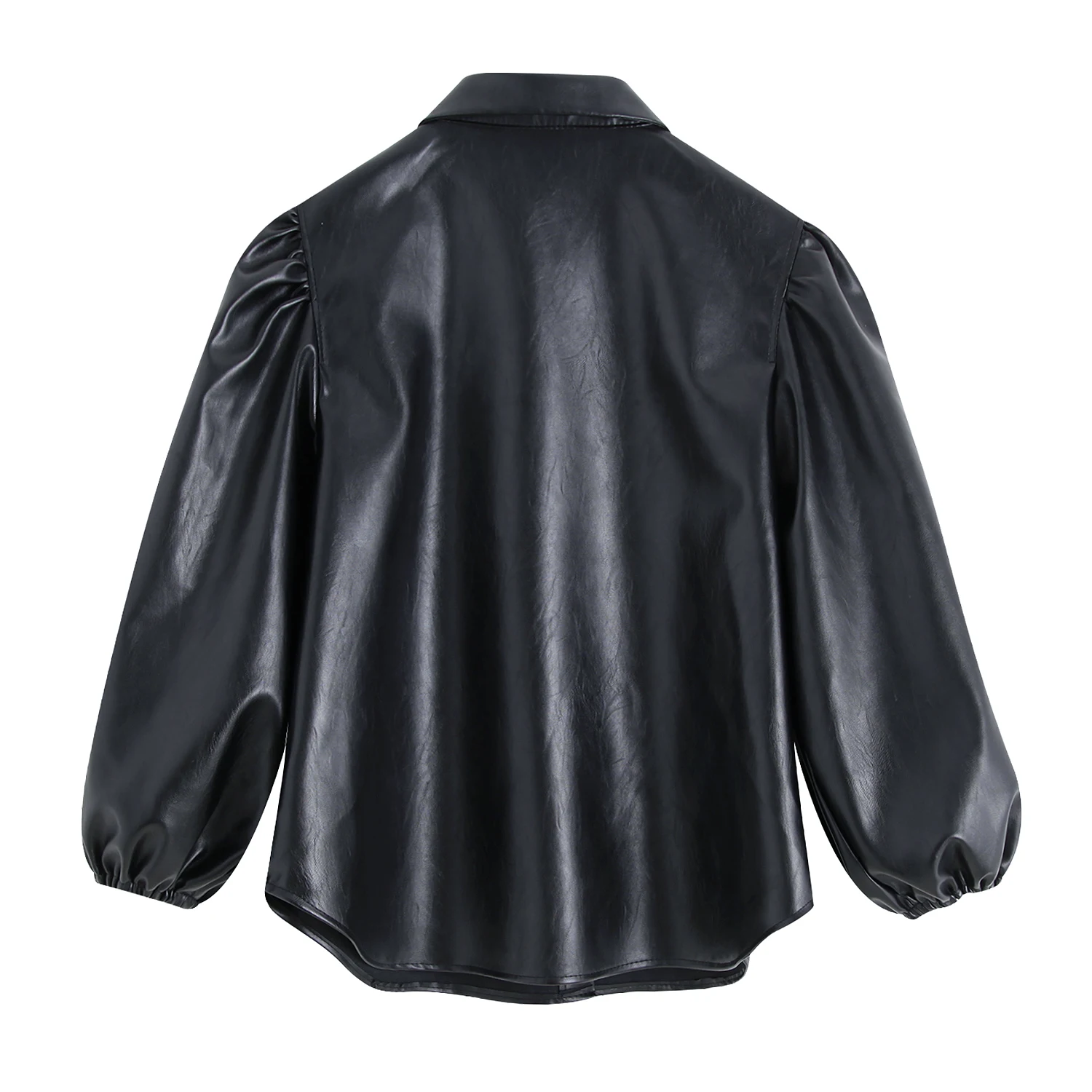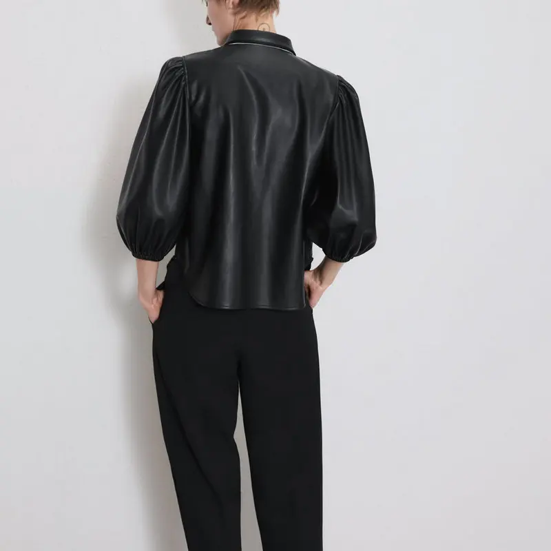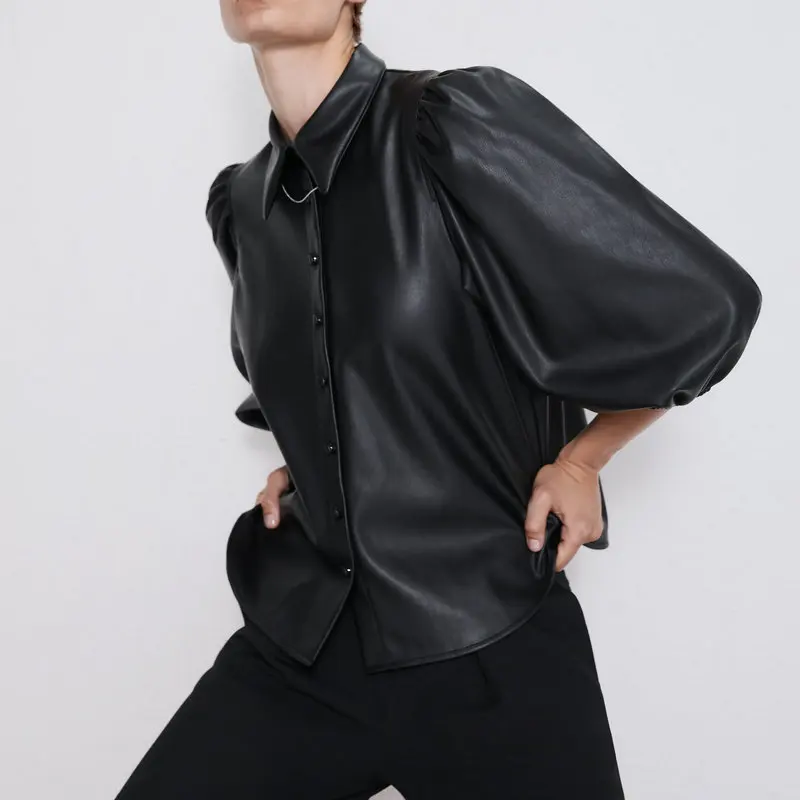 New 2020 New Fashion Women Faux Leather Turn Down Collar Blouses Fluffy Sleeve Shirts Female PU Loose E