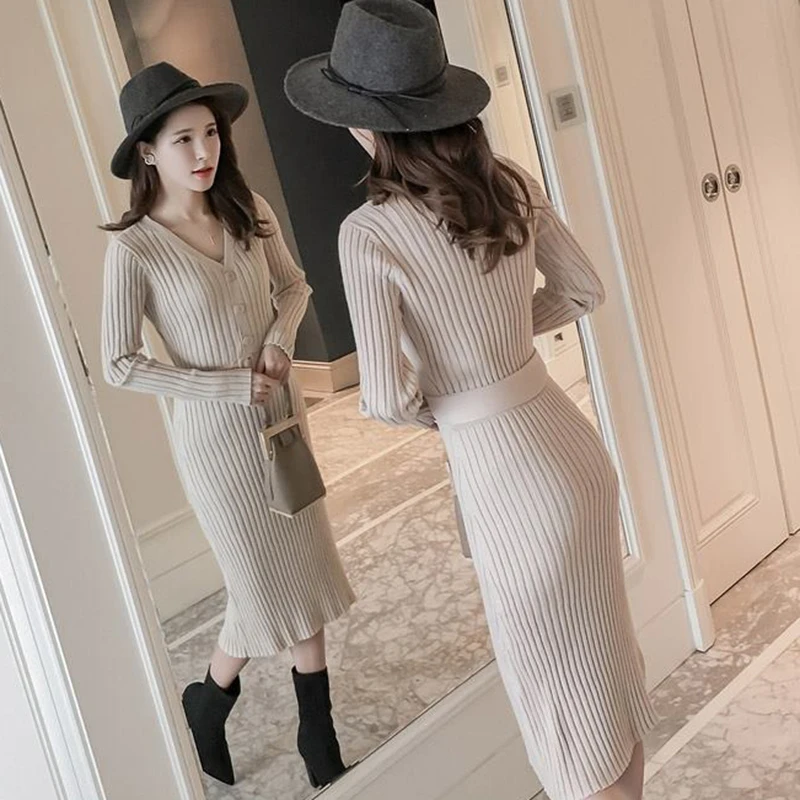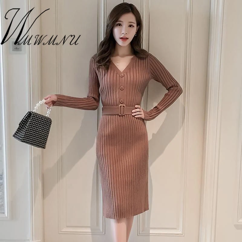 Best Fashion Single-Breasted V-Neck Sweater Dress Women Autumn Winter Knitted Jumper Dress With Belt Hig