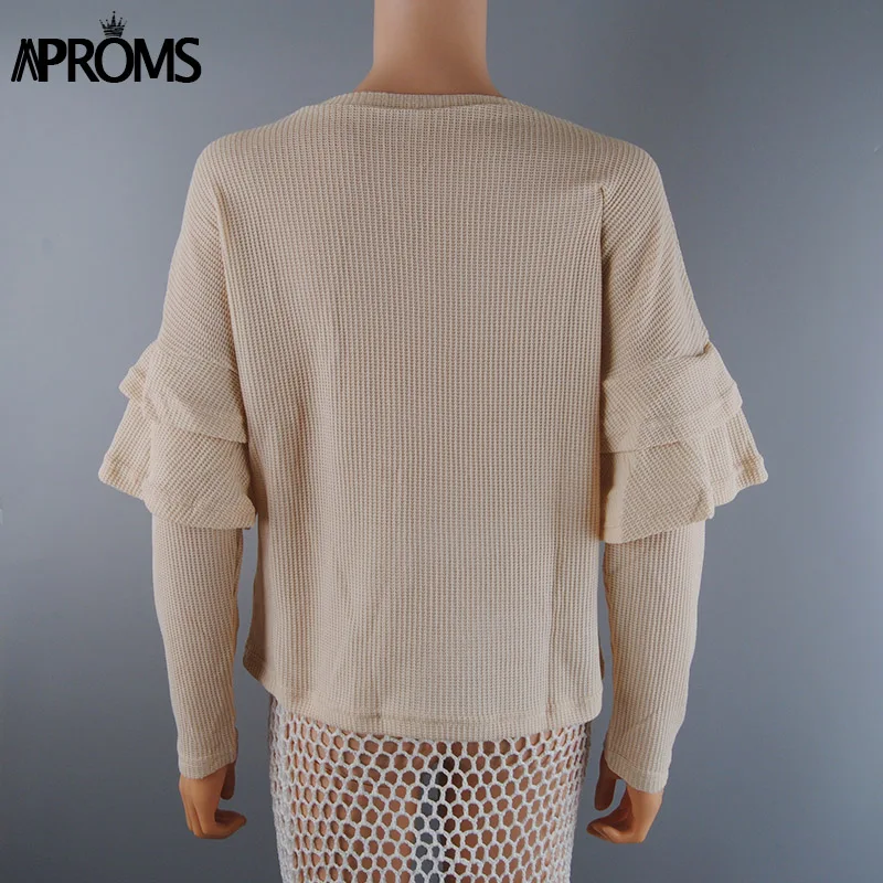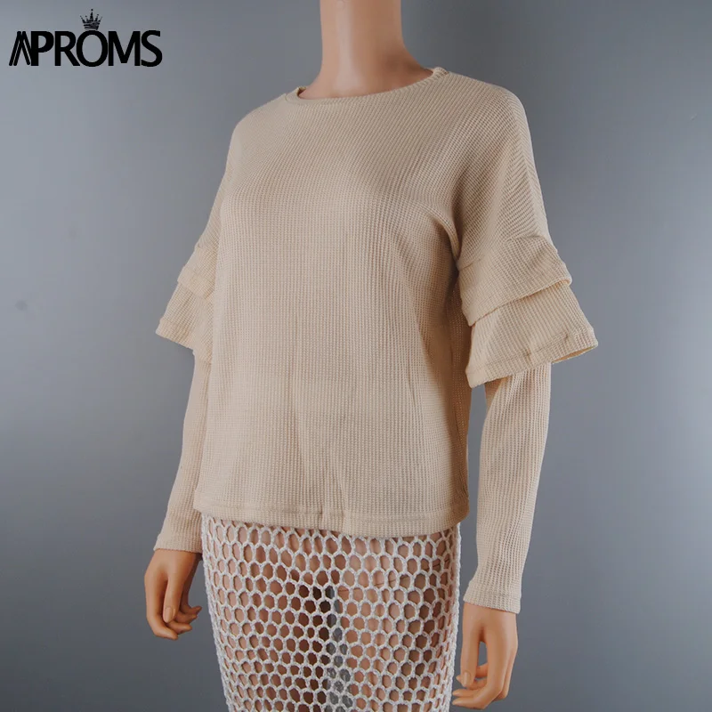 Promo Aproms Elegant Solid Color Ruffle Sleeve Women Knitted Sweater Autumn Winter Loose Pullover Sweater