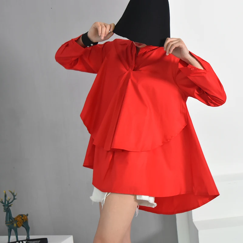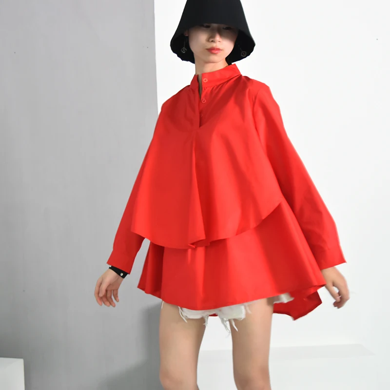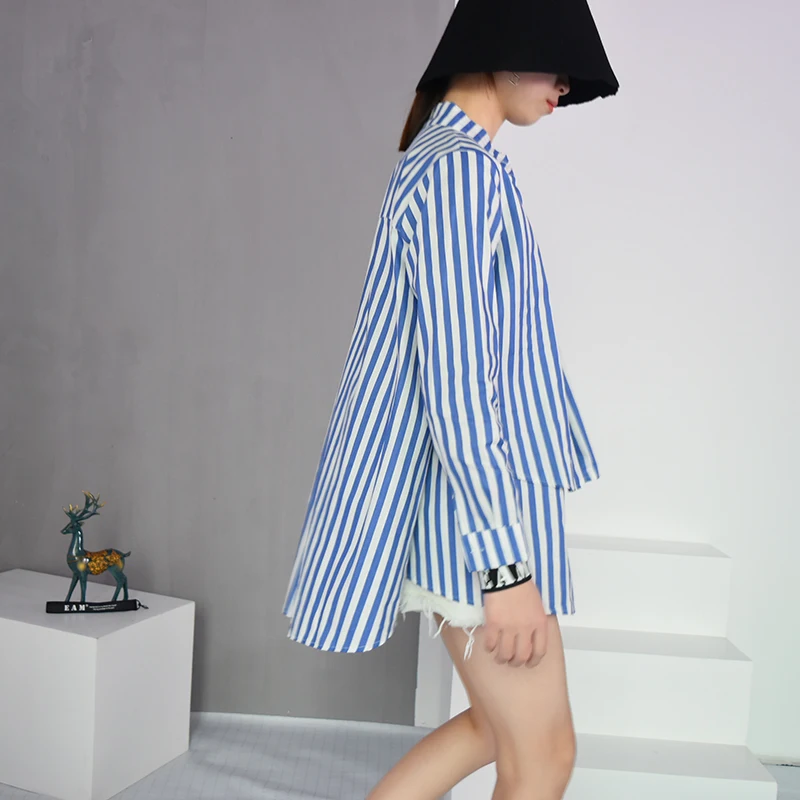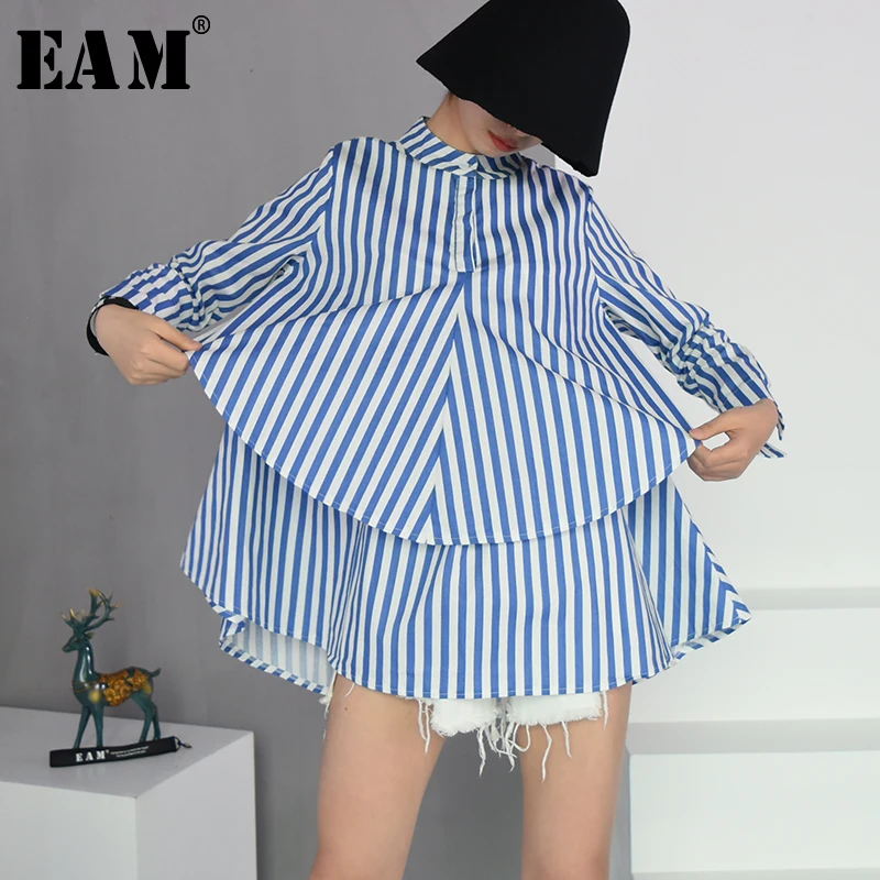 New [EAM] 2020 Autumn Winter New Fashion Stand Collar Long Sleeve Blue Striped Loose Big Size Double-de